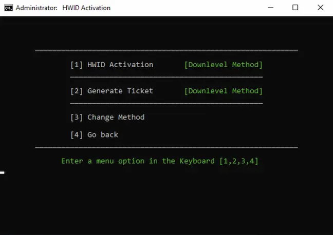 From there, type the number on your keyboard of the corresponding activation method you chose from before. You’ll most likely want HWID, which is option one. If for any reason you’d like to be able to de-activate your license, do not choose HWID. Otherwise, continue with the activation.