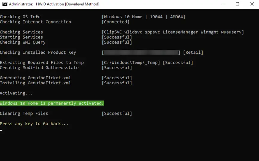 If you chose HWID, you’ll see a second screen which asks if you’d like to continue with activation. Type 1 to continue. The process from here will be automatic.