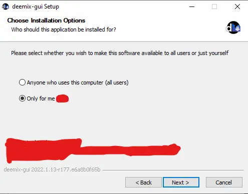 Next, you’ll be prompted to chose whether to install deemix for all users, or just the current one.