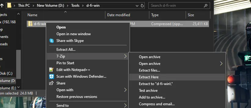 Next we’re going to make a folder somewhere and call it D-fI. Then, we’re going to place the .zip file we just downloaded into that folder and extract it using the “extract here” option.