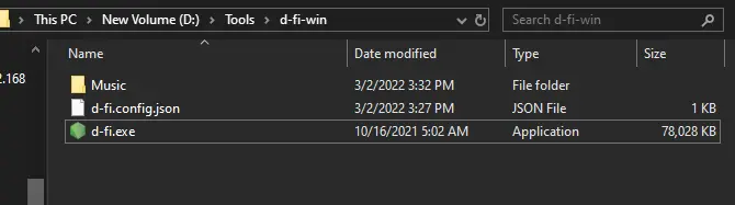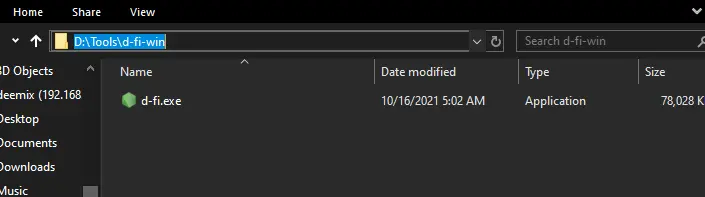 Since D-fi is a command line tool, we’ll have to open the command line to do that. Doing so is very simple. Open the folder you placed the D-fi.exe in then click on the file path bar. Then type CMD and hit enter.