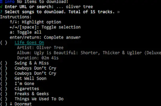 You will see a list like this if you type an artists name to search. Use the up and down arrow keys to navigate the list, and the left and right arrow keys to select/deselect entries. Then simply hit enter and your selections will download into a folder titled “Music” in the folder itself.