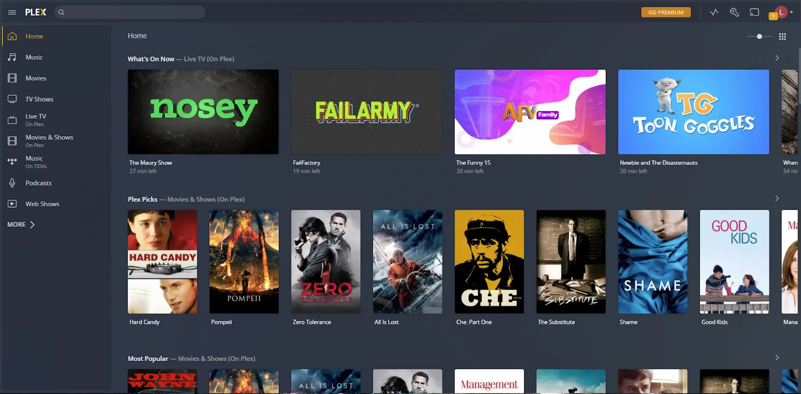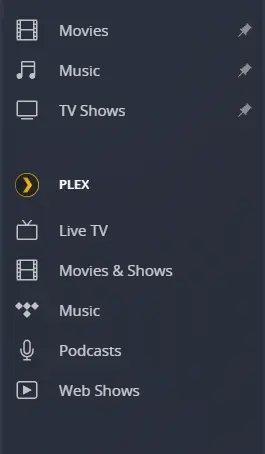 The first thing you’ll notice is a bunch of content on the home page that isn’t yours. Plex has a bunch of ad-supported media, which (in my opinion) sucks. If you want to only show what you add to the server, simply click More > at the bottom of the sidebar then the pin icons underneath the Plex Categories to unpin them from your home page. While you’re there, feel free to pin the libraries from your own servers.