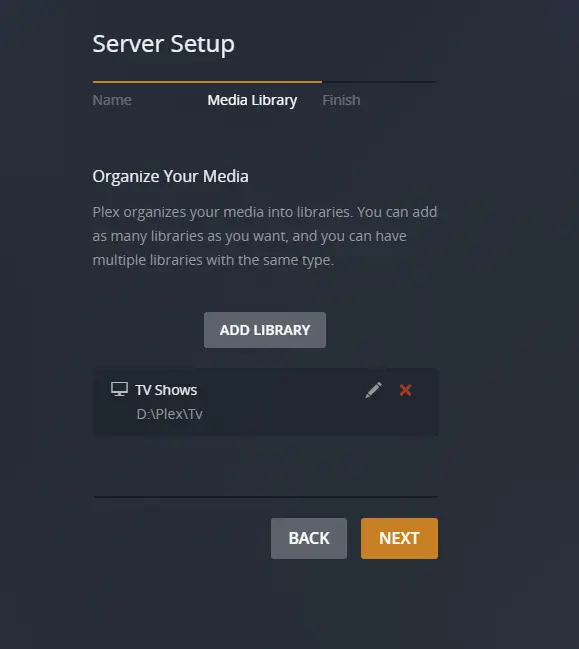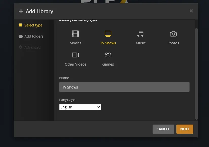 This is where you’re going to create your libraries. Click Add Library and select the media type you want. In this guide we’re adding TV, Music, and Movies so we’ll select TV first.