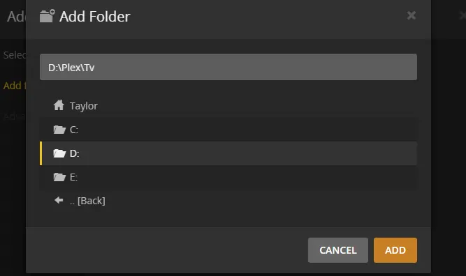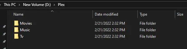 Now, open file explorer and create the actual folders where you’re going to store the media. Ours sit under D:\Plex but they can be wherever we want.
