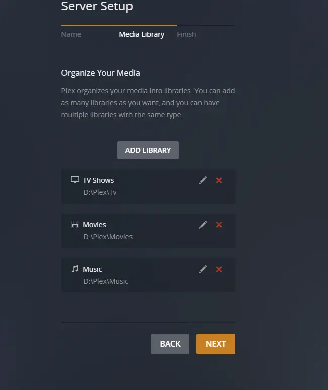 Repeat the steps above for Movies and Music, making sure to select the correct media type and folder. At the end it should look like this. If it does, select next, then finish setup.