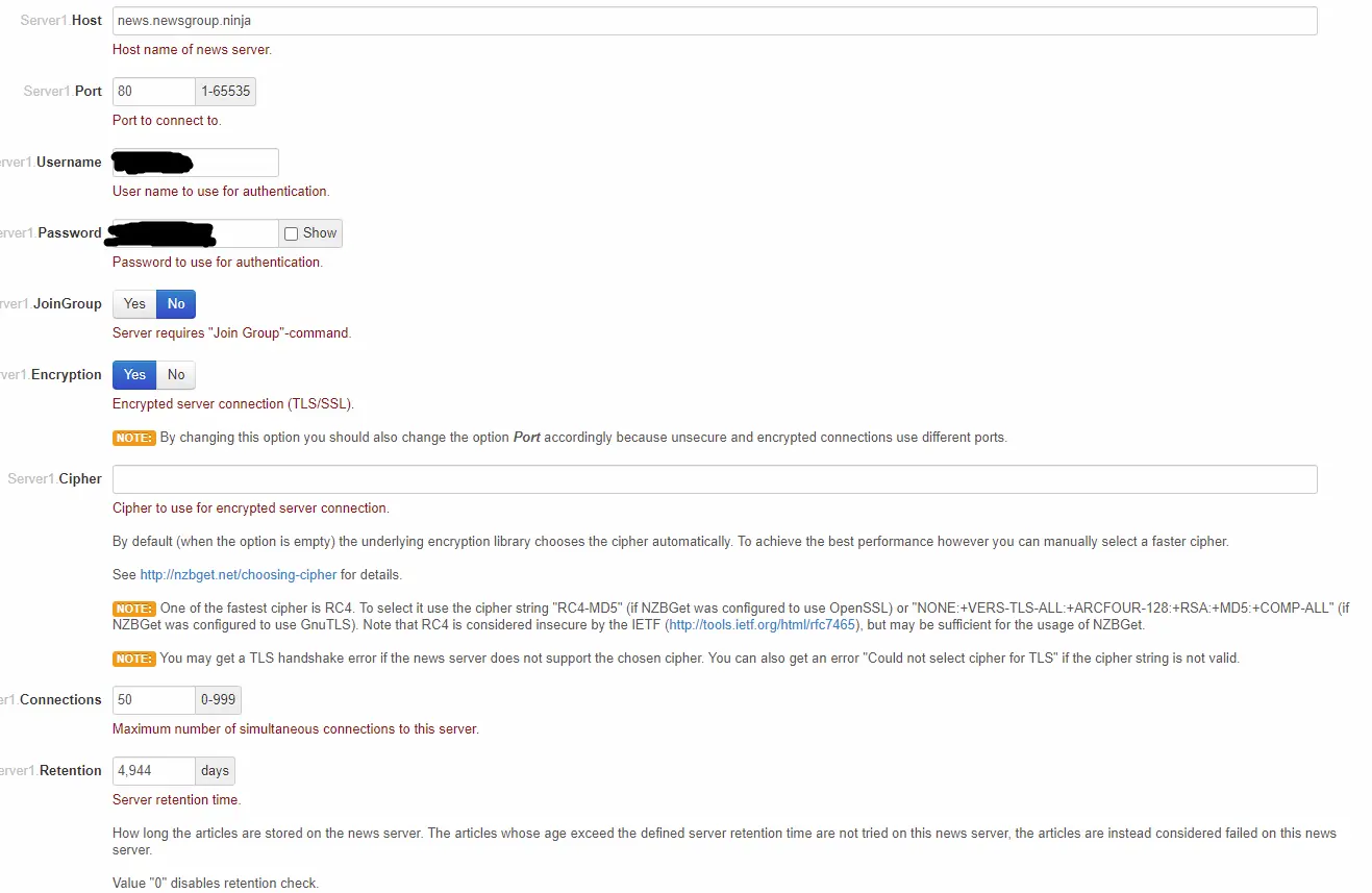 Here is where we’re going to enter our credentials we made in step one for the Usenet server provider. Fill in the details for Server1, making sure that it says “yes” is clicked for the active field. Give it a name, and leave everything else blank then scroll down to the host field. Here is where the hostname and login details go. You’ll find the hostname in your profile on the website of whatever Usenet provider you’re using. For example this is what it looks like on Ninja.