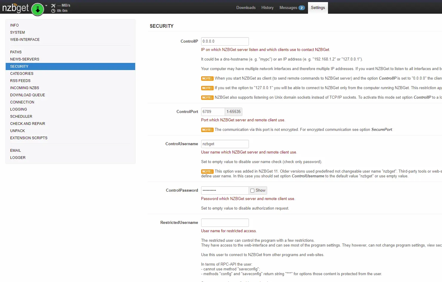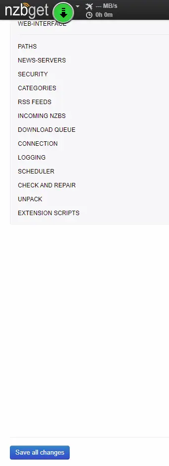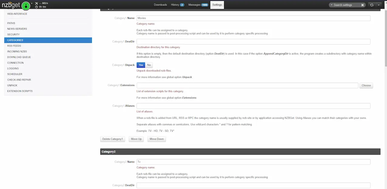 This Section isn’t inherently useful on its own, but it is if we’re going to use Sonarr and Radarr to manage our downloads. Change the name of Category 1 to Movies and the name of Category 2 to TV. After this, scroll to the bottom of the page and click “save all changes” then “Reload”. NZBGet should be all set up now.