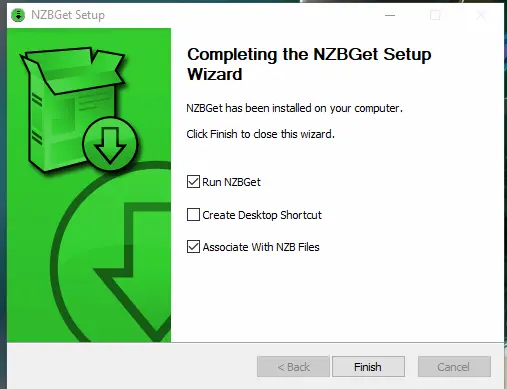 The next screen we see should tell us that NZBGet has been installed and give us three tick boxes. We want to make sure that “Run NZBGet” and “Associate with NZB Files” is ticked. Then click finish.