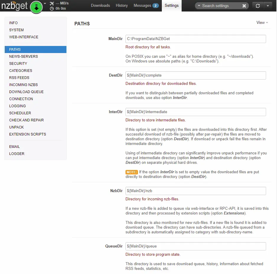 Now that we have NZBGet installed, its time to configure the program. Click settings at the top of the screen then paths in the sidebar.