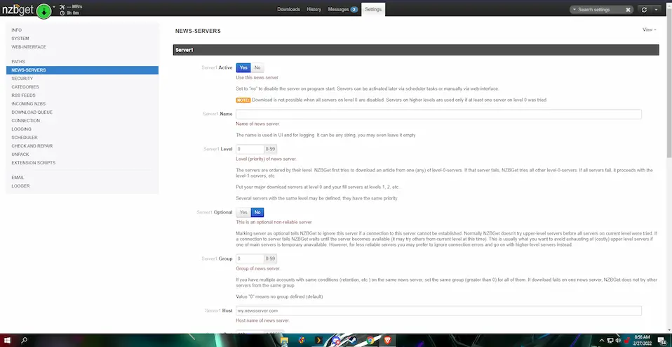 The only thing we should change in this screen is the MainDir section. We could leave it as the default but generally its better to move it out of the Program Data folder, and honestly off of the C drive entirely if we can. For this tutorial we’re going to move it to D:\Downloads\NZB. Next we move on to the News-Servers section by clicking on it in the side bar.